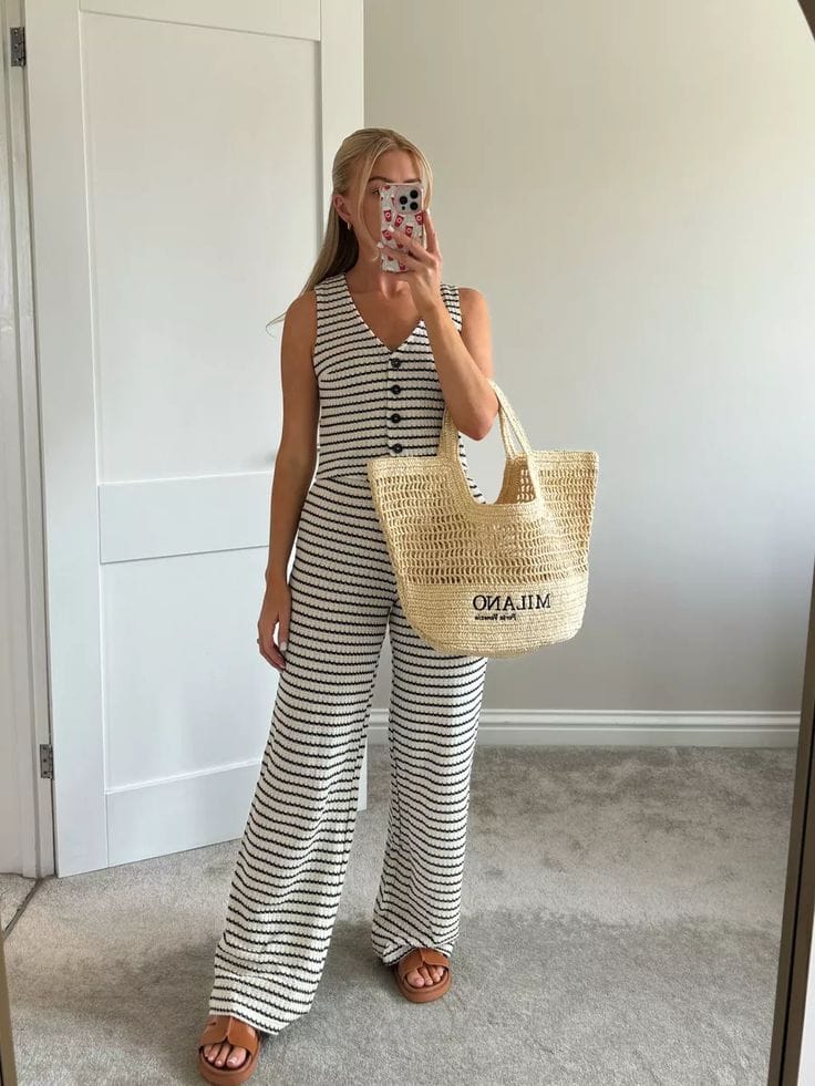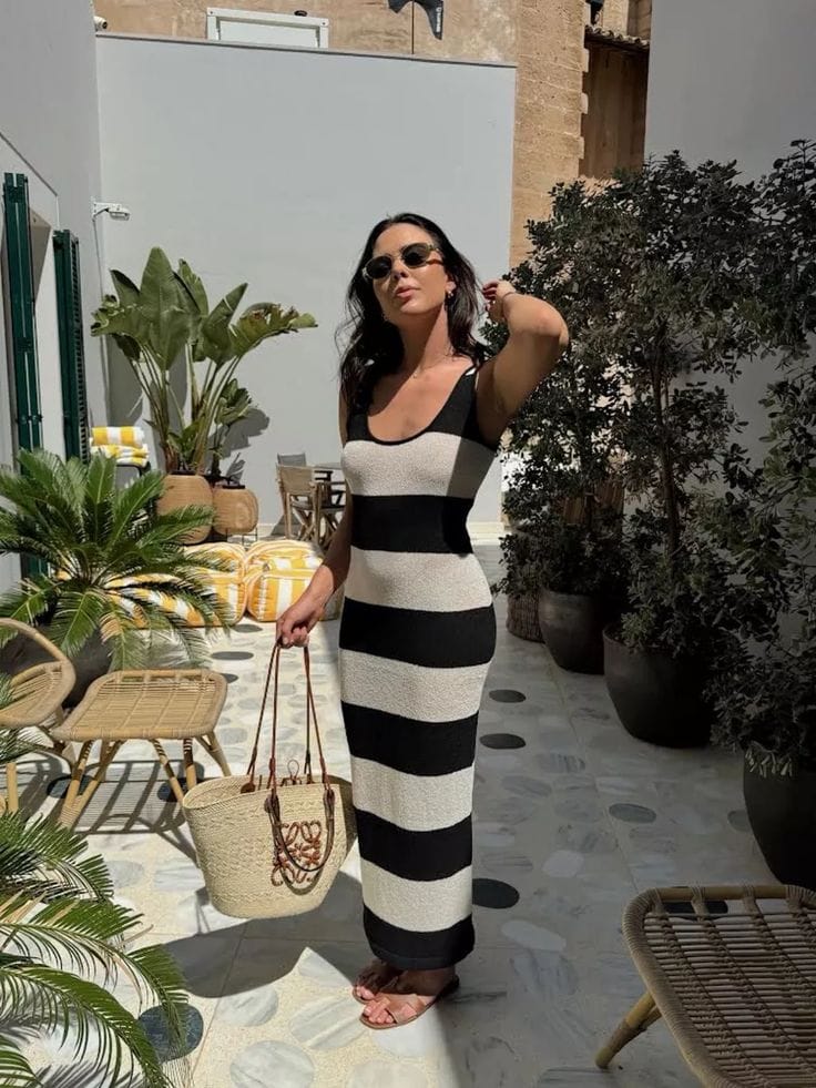 @ jessica_rosehayhurstShe’s wearing a striking black-and-white striped sleeveless knit maxi dress with a sleek tank silhouette. The textured fabric and bold stripes create an effortlessly chic, elongated look ideal for spring break glamour.ā