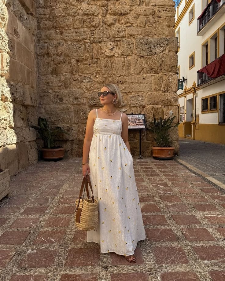 @ laura.byrnesShe’s wearing a whimsical white square-neck maxi dress adorned with playful yellow lemon prints and a full skirt. The lightweight fabric flows gracefully to the floor, capturing effortless spring break charm.ā