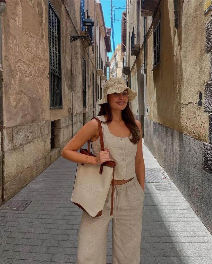 @ megancryderShe’s wearing a textured beige tank vest top with thin straps and matching wide-leg linen pants. The relaxed, breezy fit in neutral tones delivers timeless spring break sophistication.