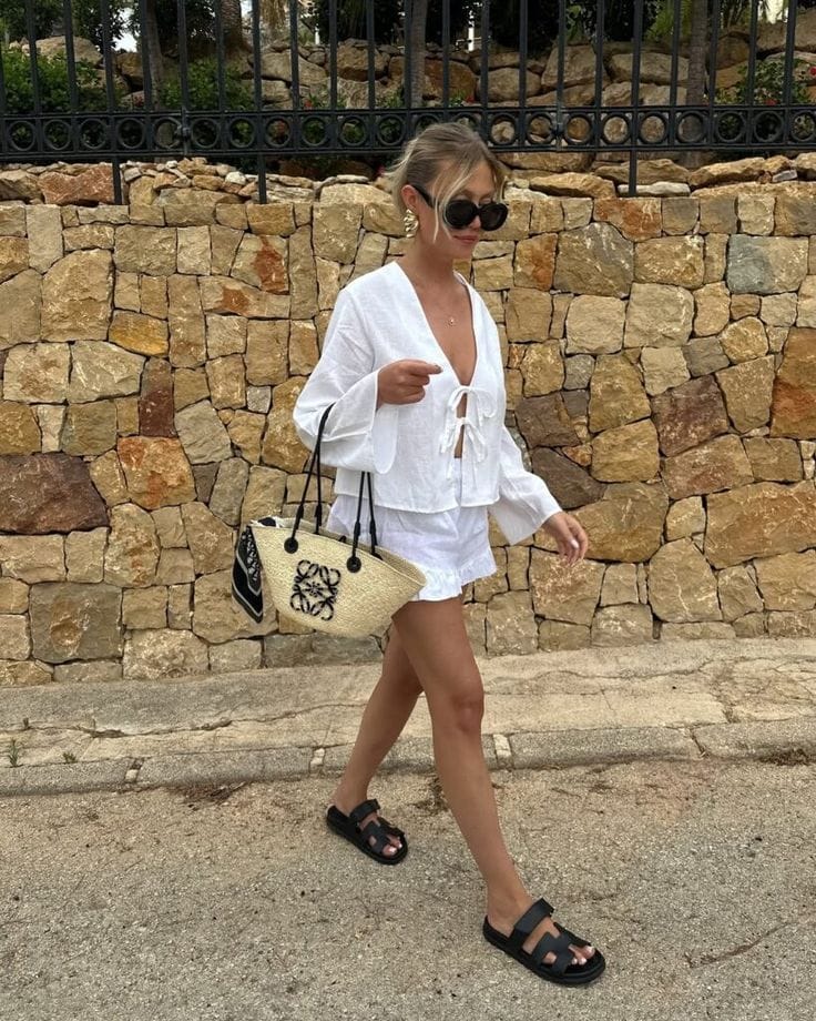 @ marine_dietShe’s wearing tailored white mini shorts with a clean, structured fit, layered under a flowing white long-sleeve button-up shirt tied at the front. The monochromatic linen-like fabric gives a fresh, polished edge for spring break strolls.ā