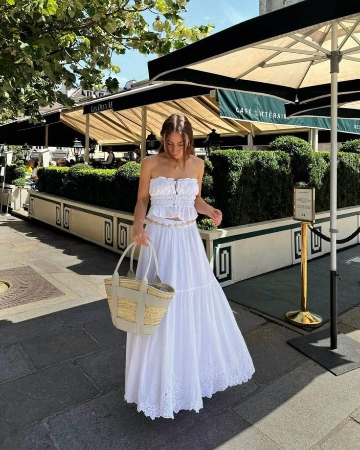 @ lise_frtShe’s wearing a romantic white strapless bandeau top with ruffled detailing and a matching multi-tiered maxi skirt with lace trim. The airy cotton fabric flows beautifully, evoking boho elegance for spring break days.ā