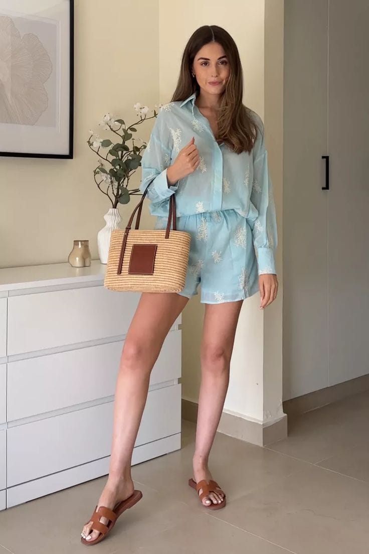 @ jessieblue_Sheās wearing a light aqua long-sleeve button-up shirt with a relaxed, breezy fit and subtle white prints. The matching high-waisted shorts complete the coordinated look with a soft, flowy silhouette perfect for spring break.ā