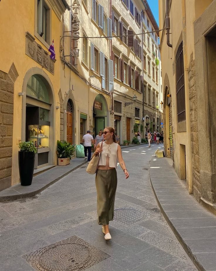 @ PinterestShe’s wearing a crisp white sleeveless crop top paired with flowing khaki green midi skirt. The minimalist combo exudes relaxed urban elegance for spring break explorations.ā
