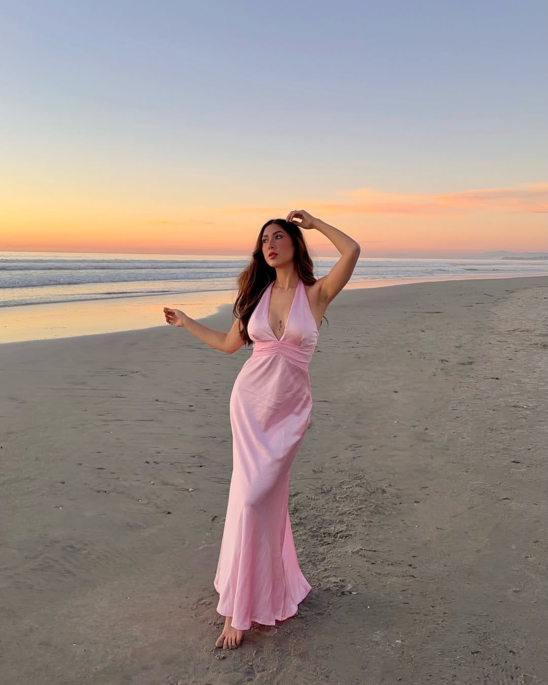 @ taniabydayShe dons a sleek blush pink satin slip dress with spaghetti straps and a halter-style deep V-neckline. The floor-length gown flows with a subtle mermaid flare, offering effortless beachside glamour.