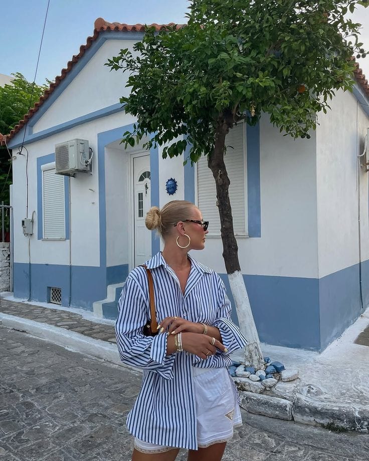 @ barbarakristoffersenShe styles an oversized blue-and-white striped cotton button-up shirt with rolled sleeves. Paired with tailored white mini shorts, it creates a fresh, laid-back coastal ensemble.
