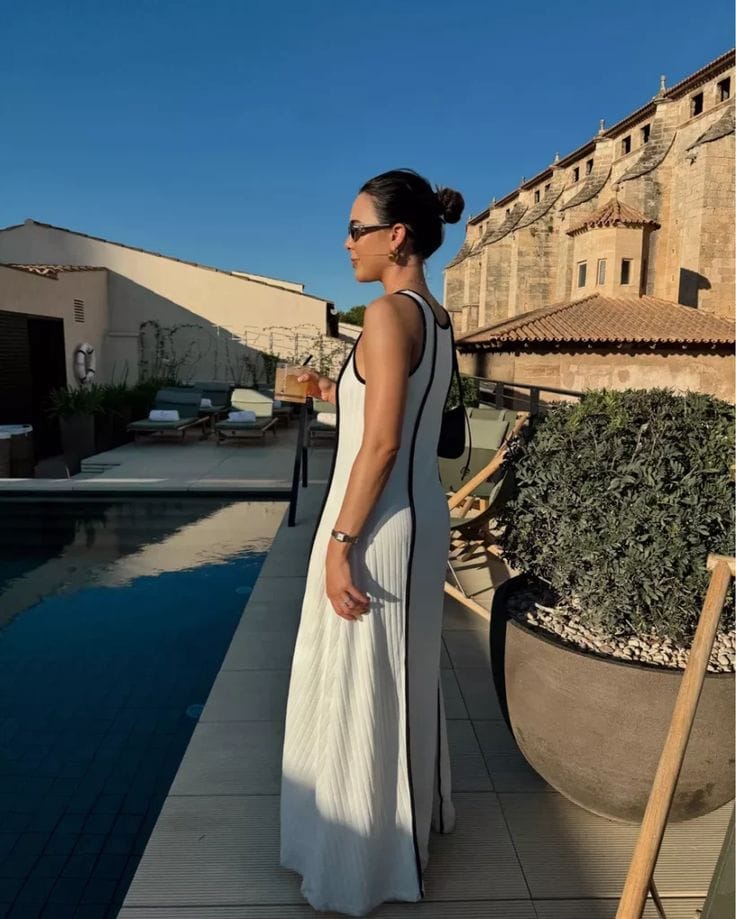 @ jessica_rosehayhurstShe’s wearing a sleek white sleeveless maxi dress featuring subtle black piping along the straps and sides. The textured knit fabric drapes elegantly with a floor-length hem, offering a sophisticated yet breezy vibe ideal for spring break.