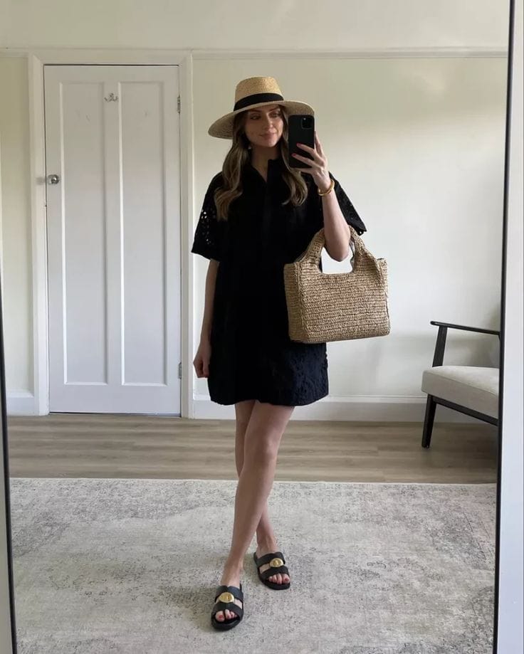 @ emilyjbullShe’s wearing an elegant black mini shirt dress with delicate white embroidery and short sleeves. The collared neckline and button-front design offer a polished, feminine silhouette perfect for spring break outings.ā