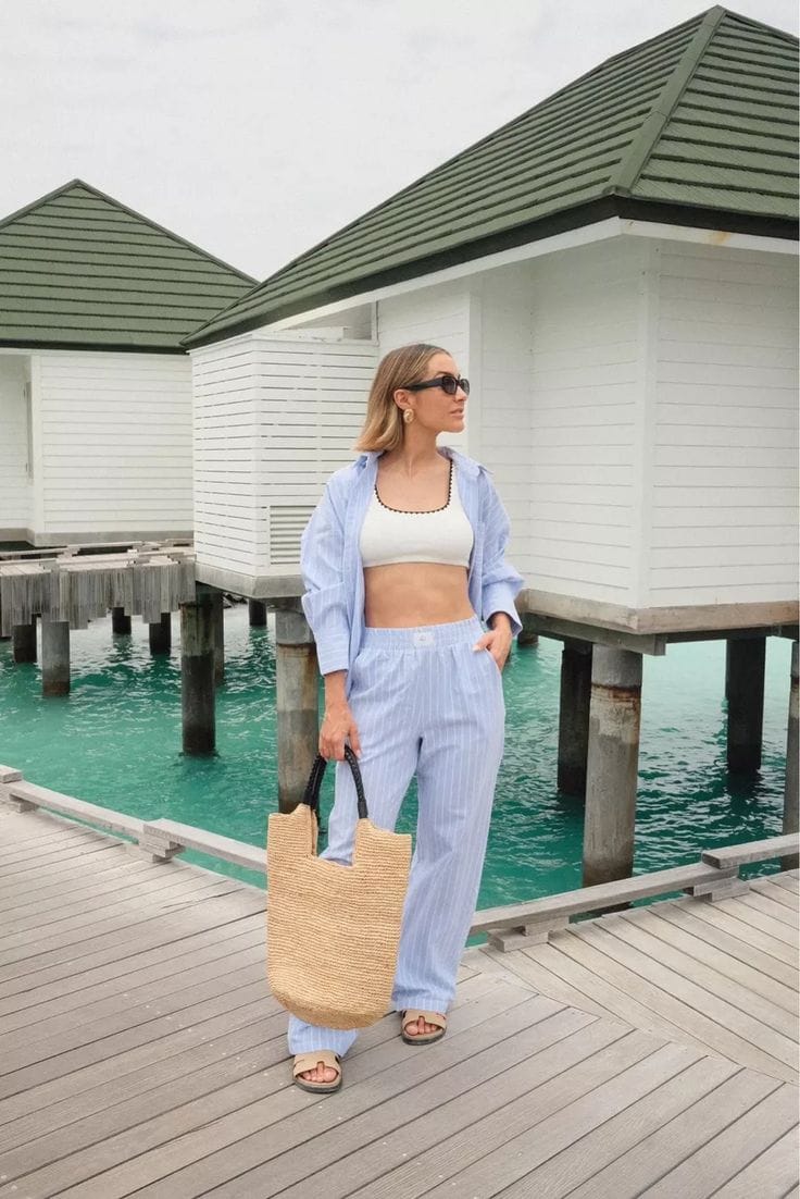 @ frankiebridgeShe’s wearing a crisp white cropped tank top paired with matching light blue striped wide-leg pants in a breezy linen fabric. A coordinating light blue button-up shirt hangs open over the top, adding a relaxed, layered beach-ready appeal.ā