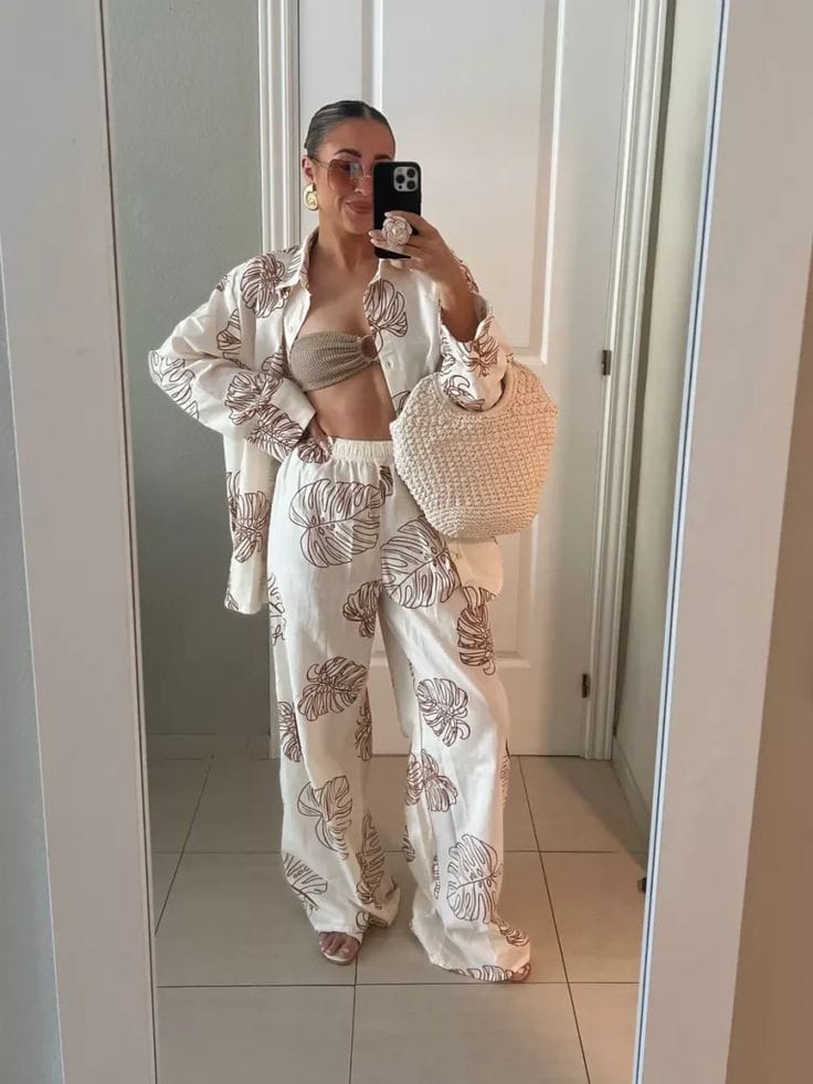 @ sophieappsShe’s wearing wide-leg cream pants adorned with elegant monstera leaf prints, paired with a matching oversized long-sleeve shirt left open. A simple cream bralette peeks through underneath, crafting a boho-chic, tropical-inspired ensemble for spring break.