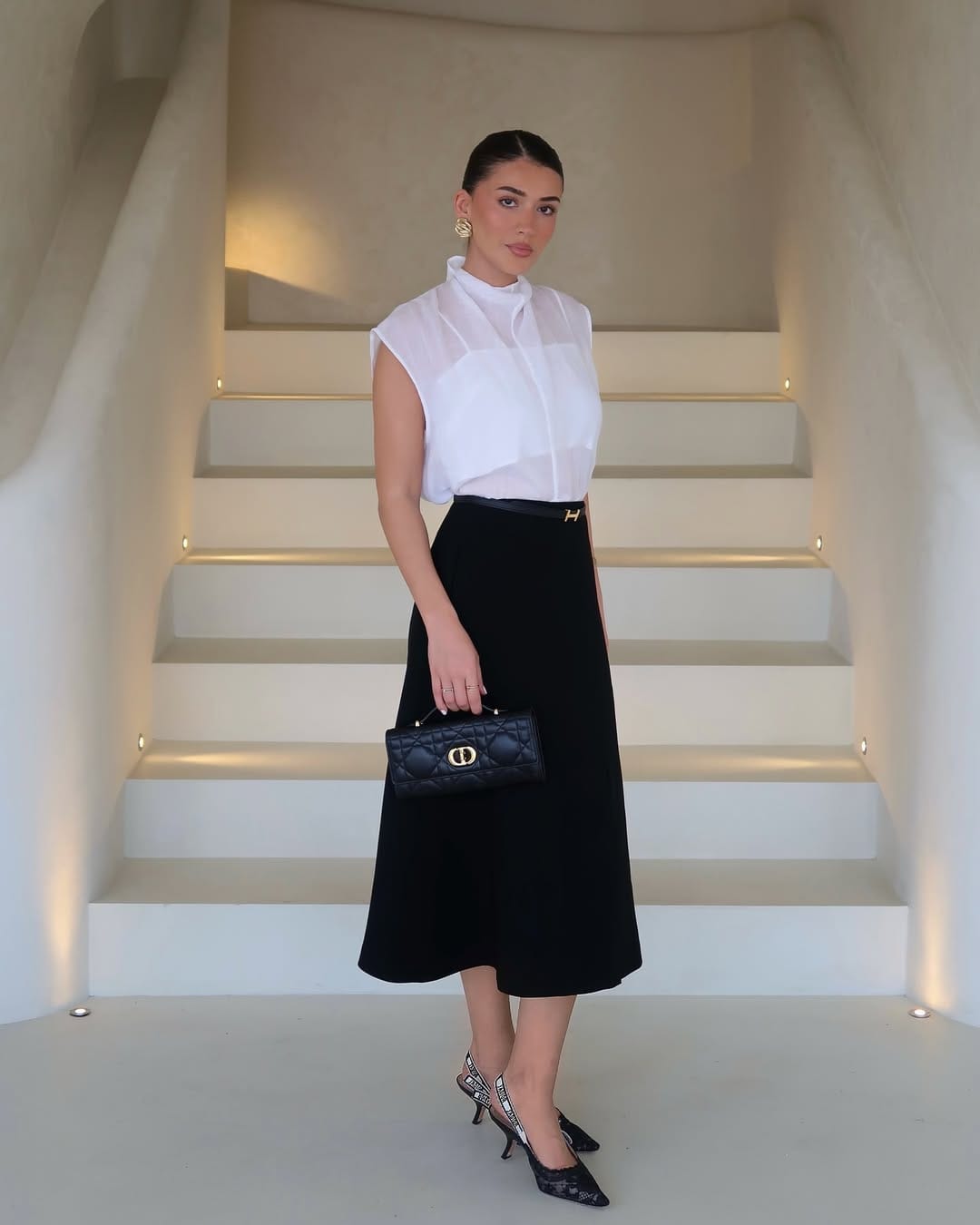 @ sherienboniA refined sheer white sleeveless blouse with soft structure is paired with a high-waisted black midi skirt for a timeless, feminine silhouette. The clean lines and flowing shape create a polished yet effortless look thatās perfect for a chic spring date night.