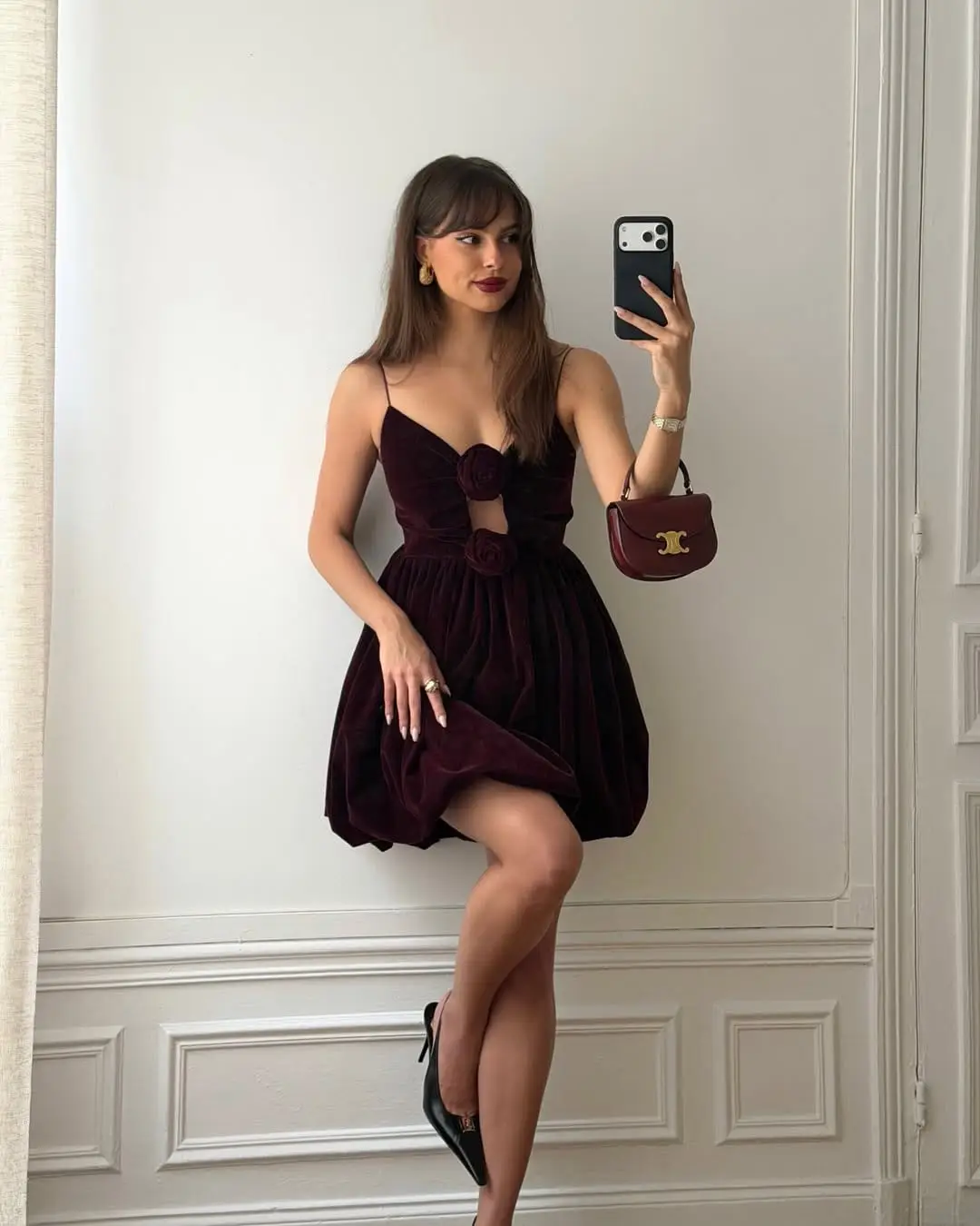 @ jodielapetitefrenchieA rich burgundy velvet mini dress with delicate spaghetti straps and statement rosette detailing creates a soft yet structured silhouette. The fitted bodice flows into a flared skirt, giving the look a playful, feminine elegance perfect for a spring date night.