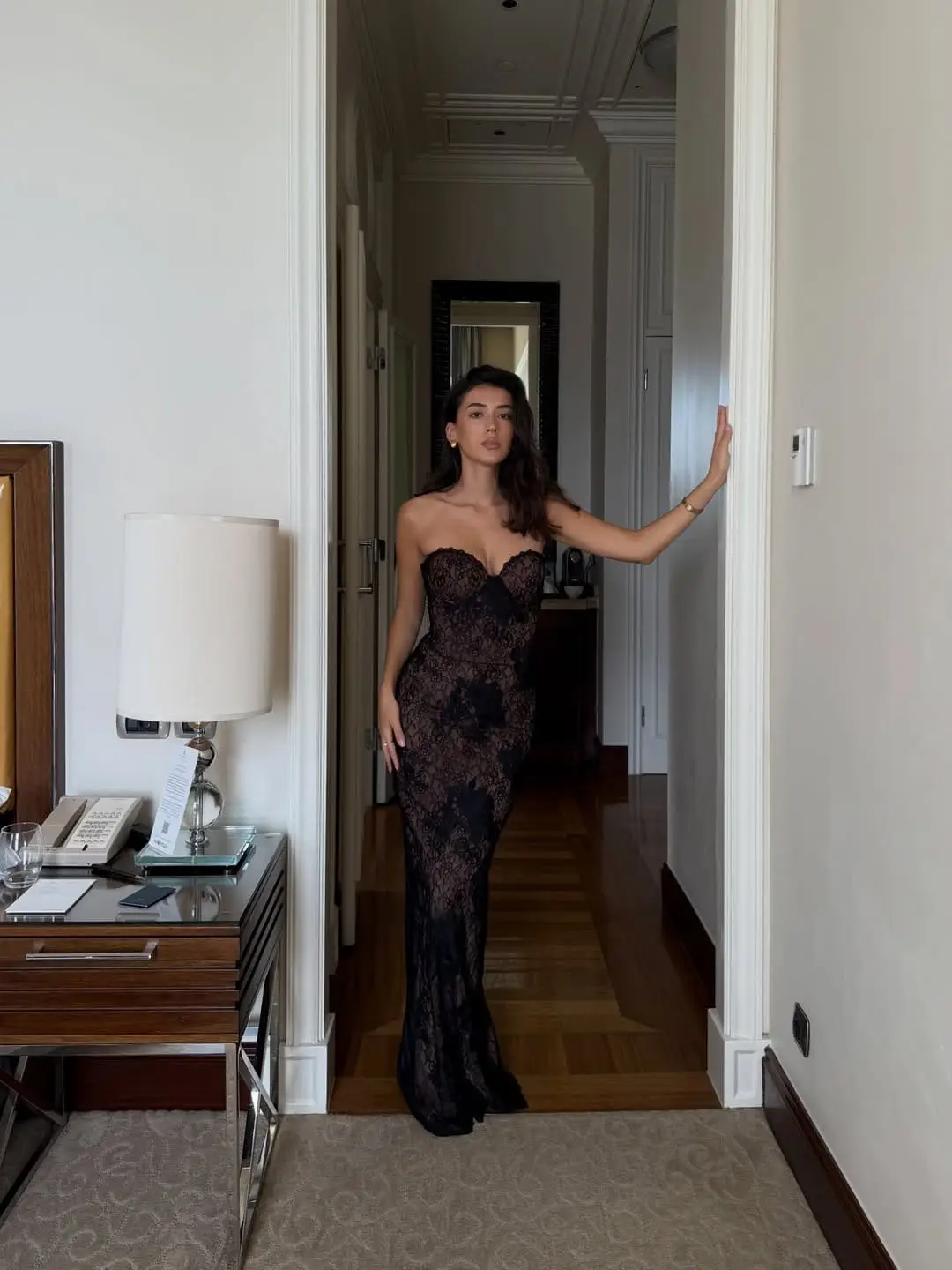 @ sherienboniA fitted strapless black lace gown hugs the body, featuring a structured bodice and a delicate sheer overlay that adds depth and drama.