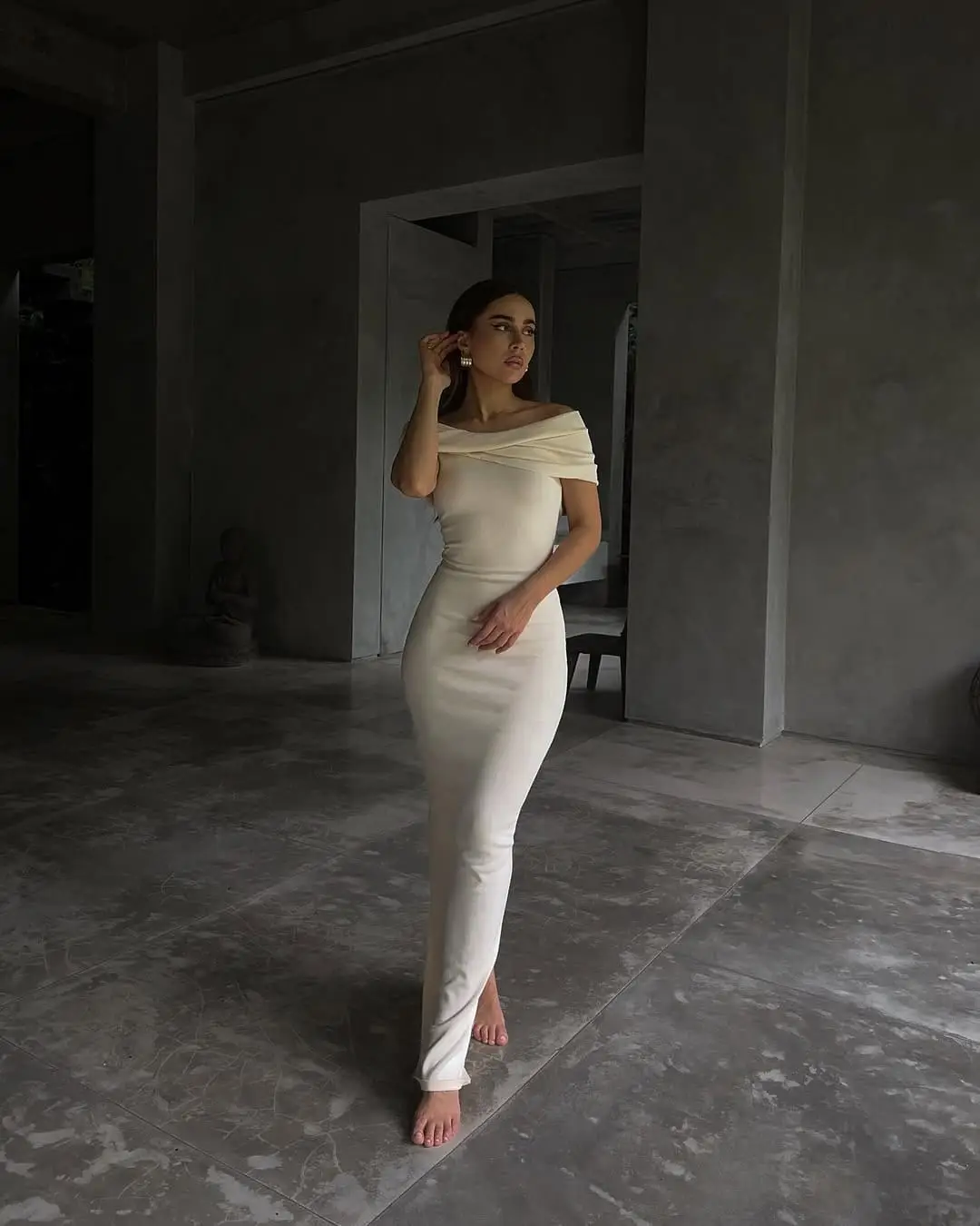 @ anna.weinThis cream off-the-shoulder midi dress embodies understated sophistication. The folded neckline detail softly frames the collarbones, while the fitted silhouette beautifully contours the body for a sleek, feminine shape. The clean lines and neutral tone give the look a timeless, refined appeal.