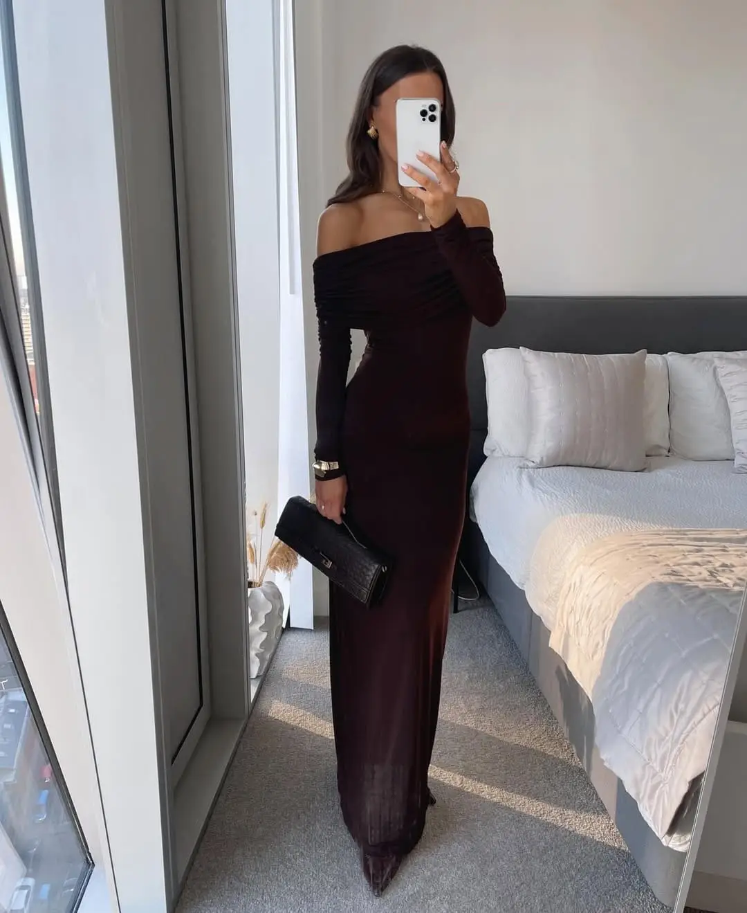 @ whatemworeThis rich chocolate brown off-the-shoulder maxi dress is the definition of understated glamour. The ruched detailing across the neckline adds soft texture, while the fitted silhouette hugs the figure beautifully from bodice to hem. Long sleeves balance the exposed shoulders, creating a look that feels both sultry and refined.