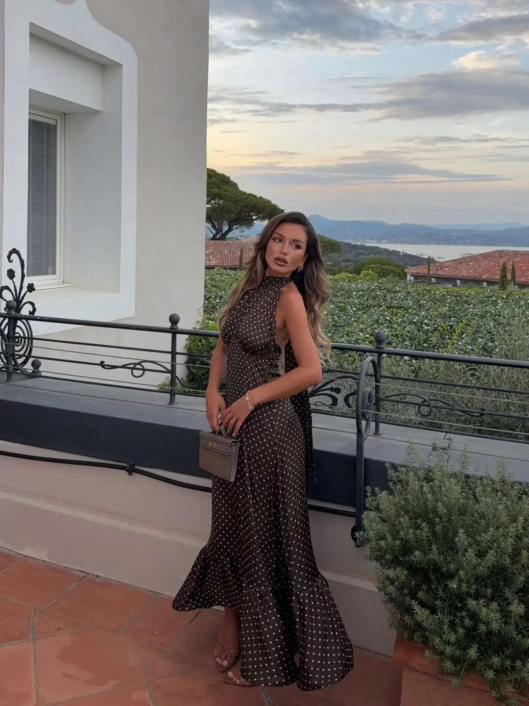 @ mimiarrA flowing chocolate brown halter maxi dress adorned with delicate polka dots creates a soft, feminine silhouette. The fitted bodice and flared hem add graceful movement, making it an effortlessly elegant choice for a spring date night.