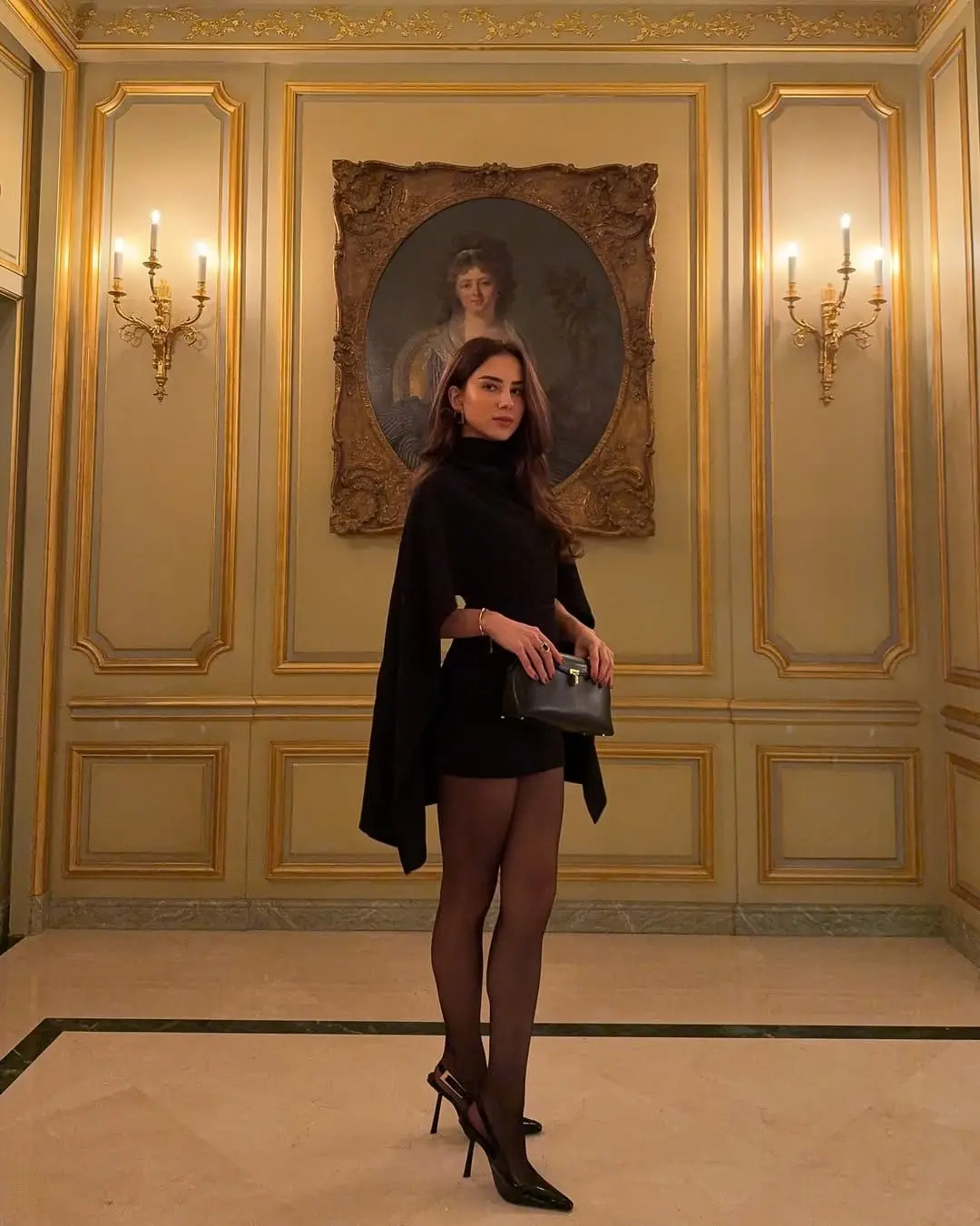 @ lucygrasssoA fitted black turtleneck mini dress creates a sharp, streamlined silhouette, elevated by a flowing cape-style overlay. The structured yet fluid layers give the look a bold, sophisticated edge perfect for a refined spring date night.