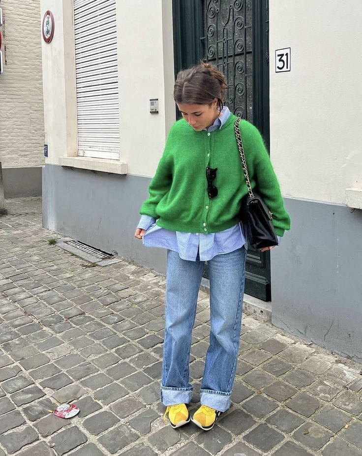 Wearing an emerald green knit cardigan over a light blue chambray shirt with rolled cuffs, paired with high-waisted blue jeans cuffed at the ankles.