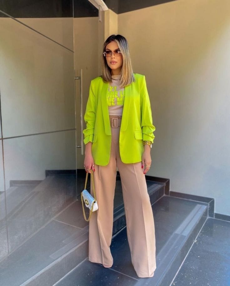 12. Electric Green Blazer & Beige Wide-Leg Pants