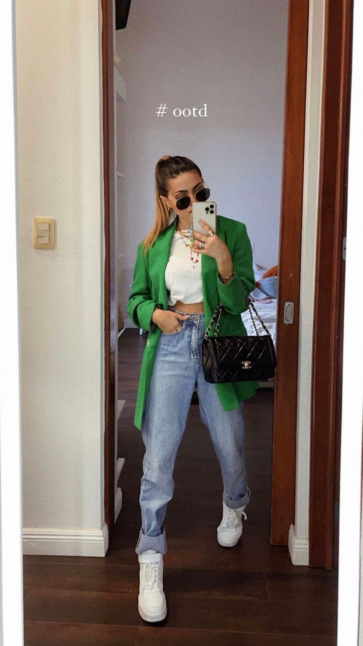 13. Lush Green Blazer & Classic Blue Jeans