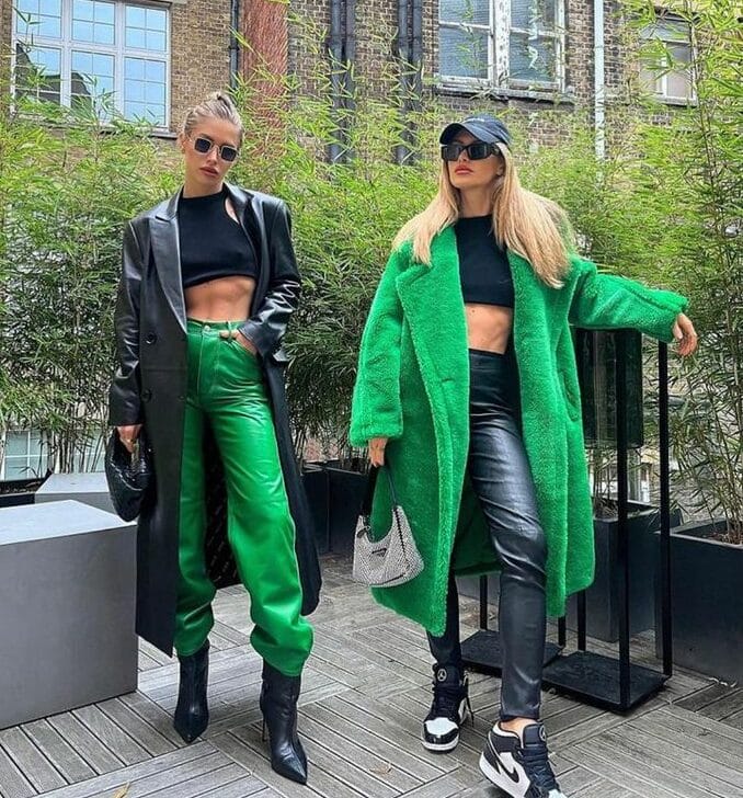 Right model wears a long plush emerald green faux fur coat over a black crop top with black leather pants; accessories include black cap, gray shoulder bag, black stiletto boots (left), white Nike sneakers (right).