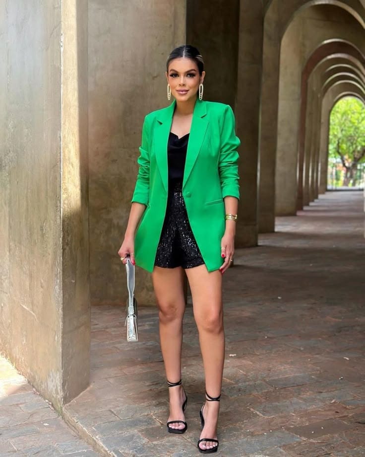 15. Tailored Green Blazer & Black Sequin Shorts