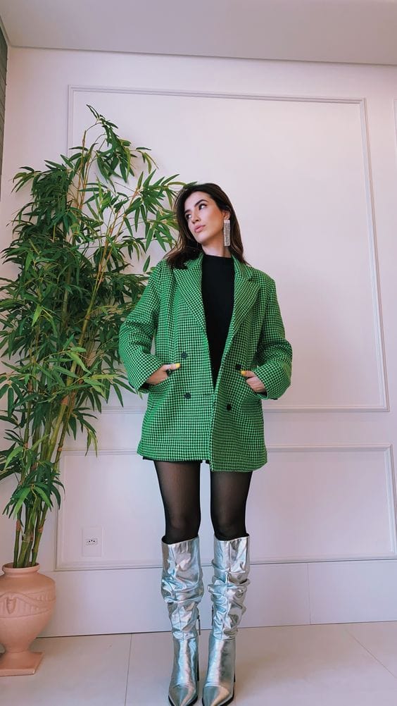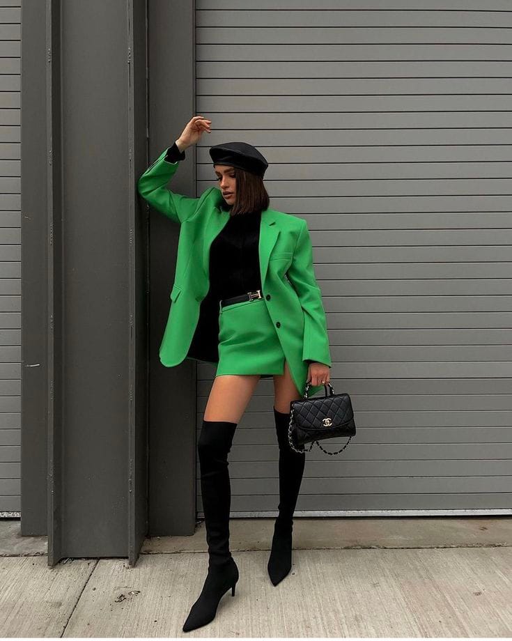 Cream blazer and matching mini shorts create a sharp base, accented by an emerald green turtleneck for St. Patrick’s Day flair. Green mini bag and over-the-knee green boots amp up the bold, fashion-forward edge.