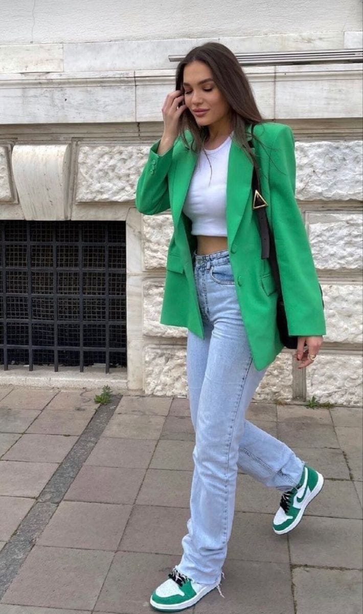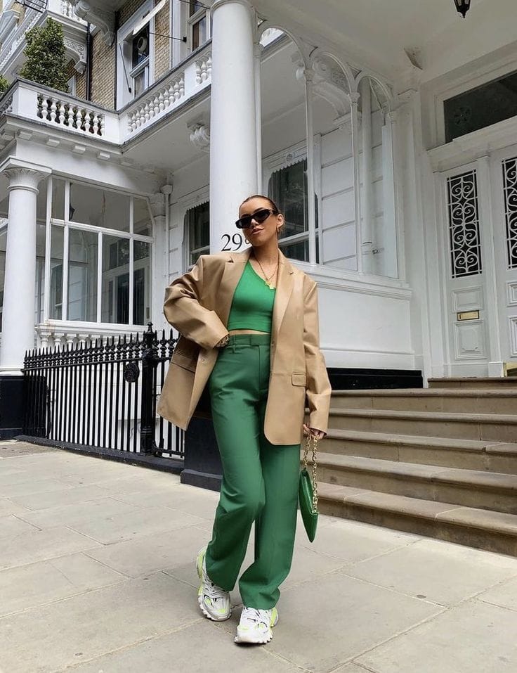 Structured emerald green blazer and high-waisted trousers form a vibrant suit perfect for St. Patrick’s Day, layered over a simple white crop top. Green shoulder bag and green-white sneakers deliver coordinated street-ready flair.