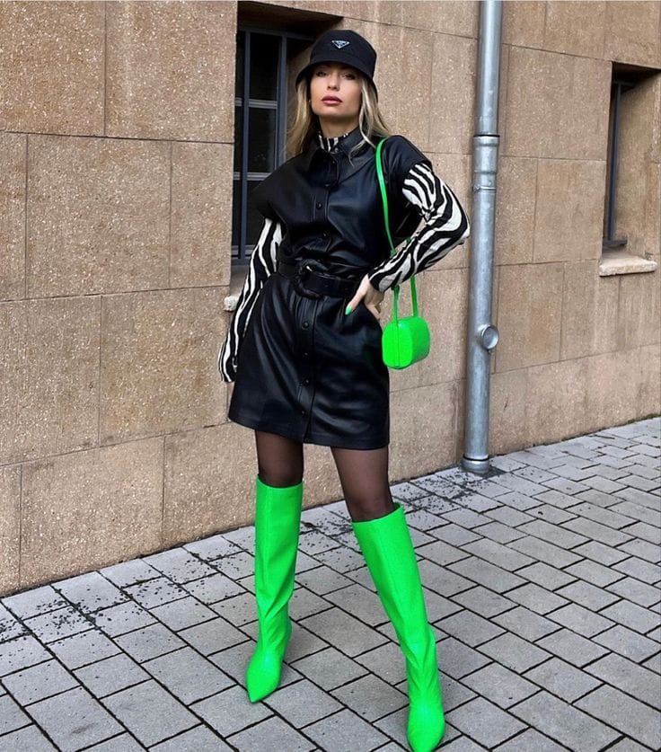 2. Sleek Black Leather Dress with Green Boots