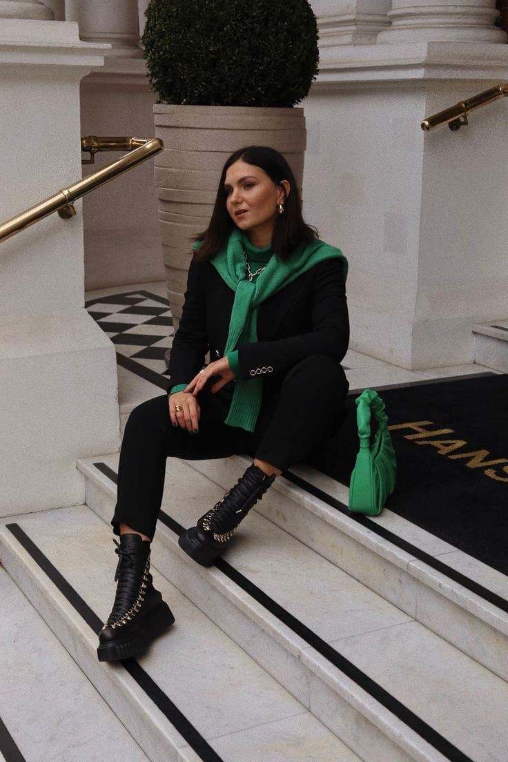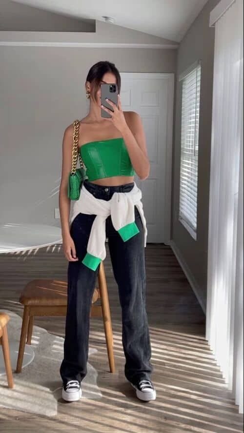 This St. Patrick’s Day outfit features a sleek black base styled with a bold green top layered over the shoulders for a chic, fashion-forward look. The matching green bag ties it all together, adding festive color while keeping the outfit polished and elevated.
