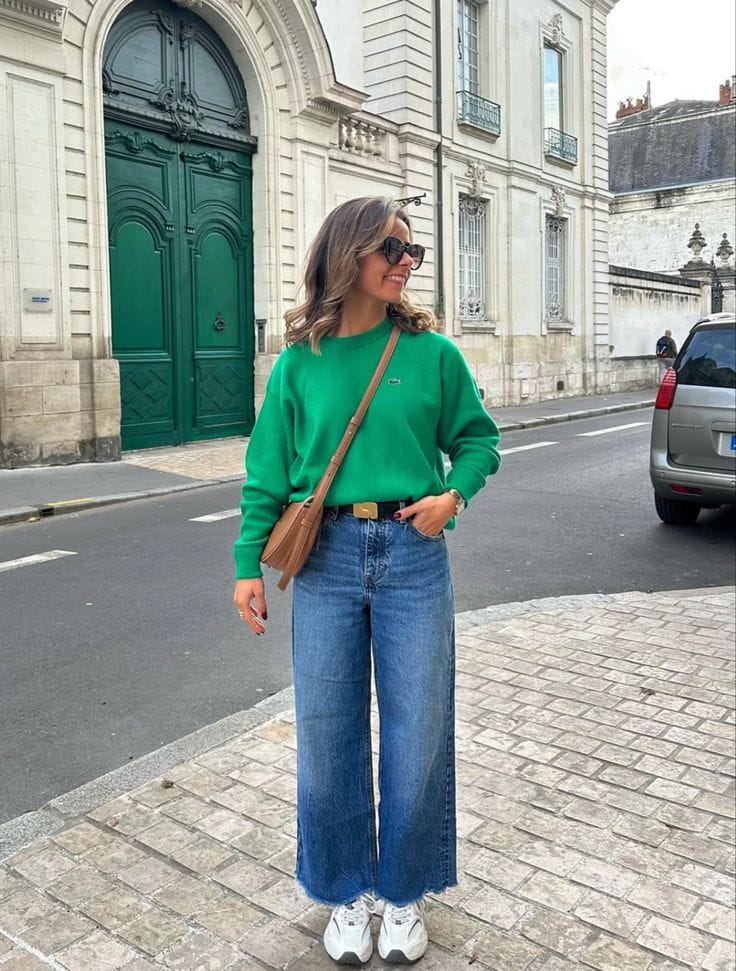 A relaxed emerald green sweater brings the St. Patrick’s Day spirit, tucked neatly into high-waisted light wash flared jeans for a flattering silhouette. Brown leather belt, matching shoulder bag, cat-eye sunglasses, and chunky white sneakers add that Parisian street-style edge.