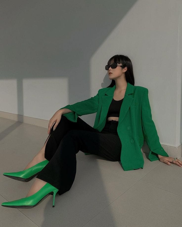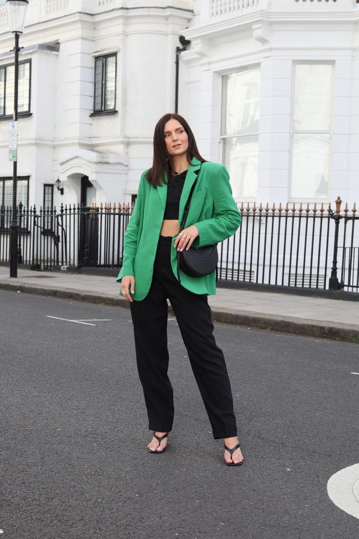 6. Vivid Green Blazer & Black Wide-Leg Trousers