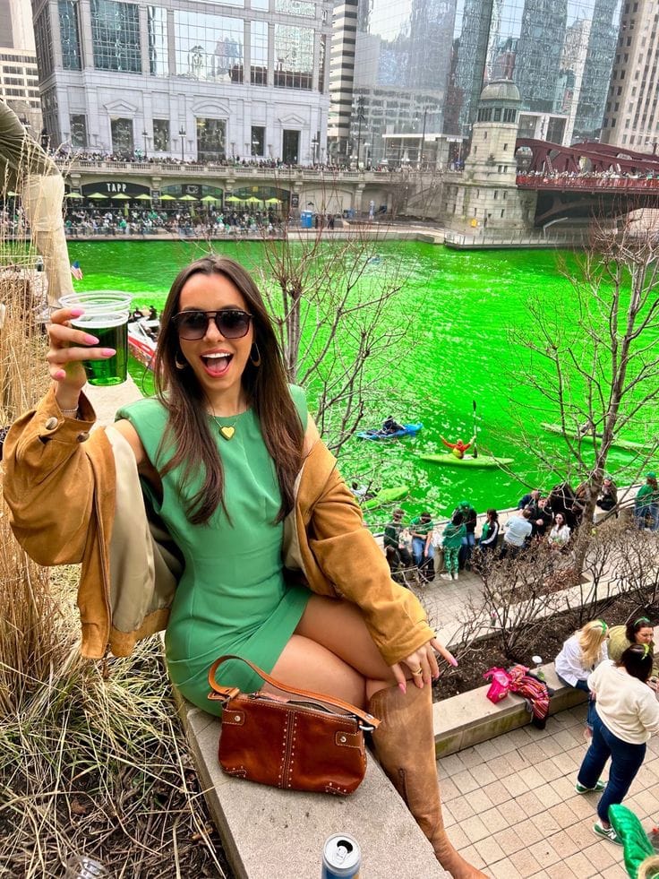 Fitted emerald green mini dress captures quintessential St. Patrick’s Day energy, dramatically layered under an oversized beige coat. Brown leather bag and tall suede boots ground the festive look amid the dyed green river festivities.