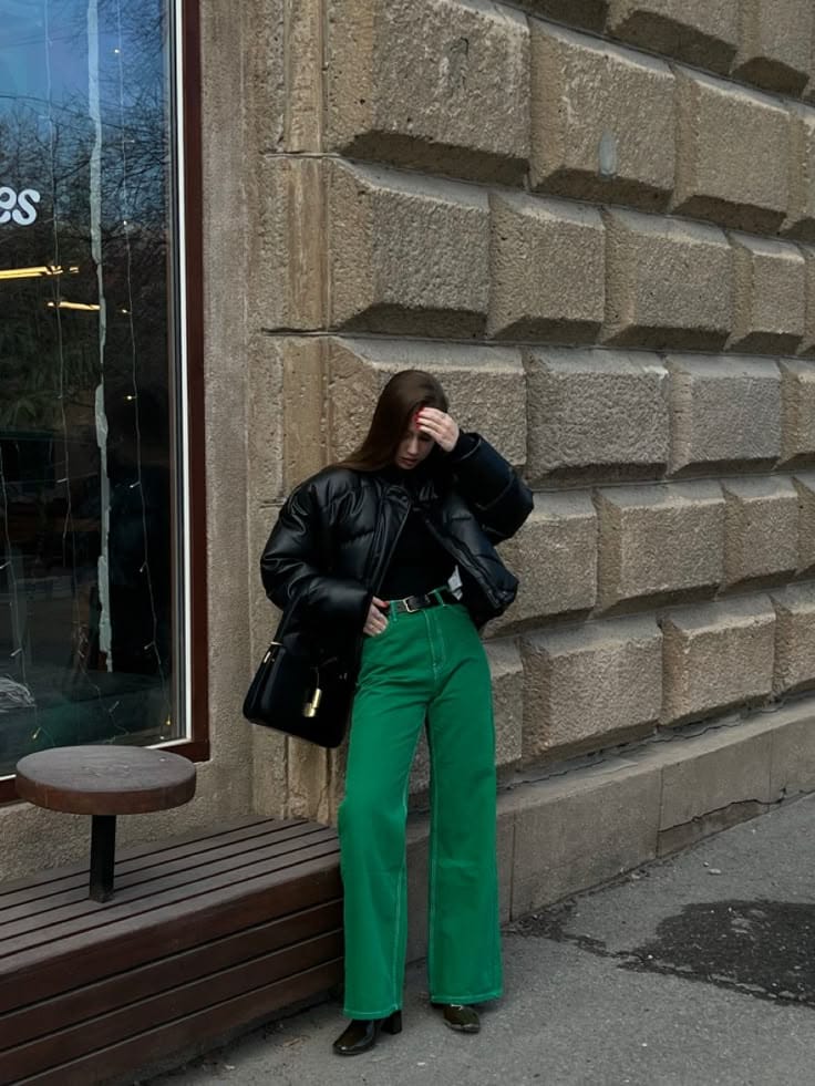 Oversized black leather bomber jacket layers effortlessly over vibrant emerald green wide-leg pants for a tough St. Patrick’s Day twist. Black turtleneck, belt, loafers, and tote bag keep the monochromatic cool intact.