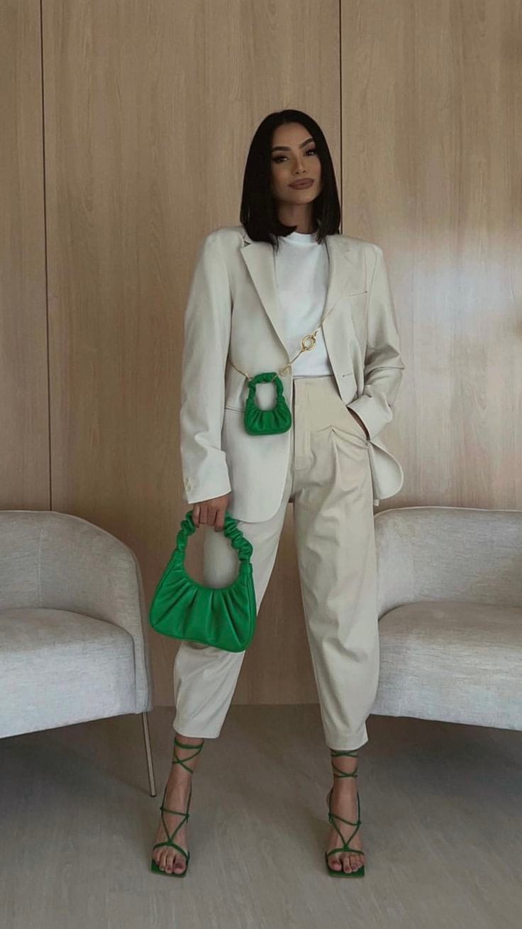 5. Cream Blazer Set with Vibrant Green Accents