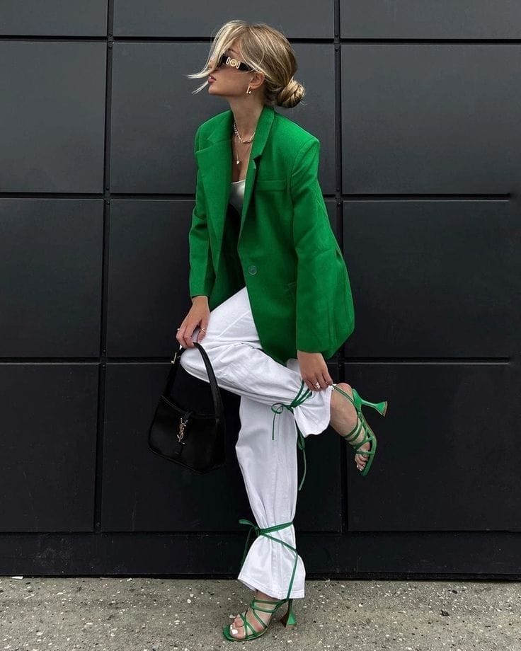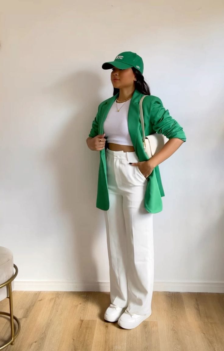 7. Chic Green Blazer with Crisp White Pants