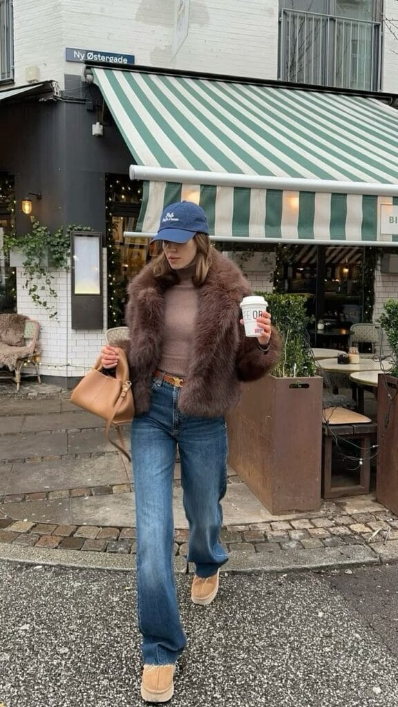 She’s rocking a plush brown fur jacket over a fitted brown knit top, paired with laid-back straight-leg blue jeans for that effortlessly cool street style vibe. The look is finished with Ugg, a chic tan handbag, and a navy baseball cap, plus a coffee in hand because of course.
