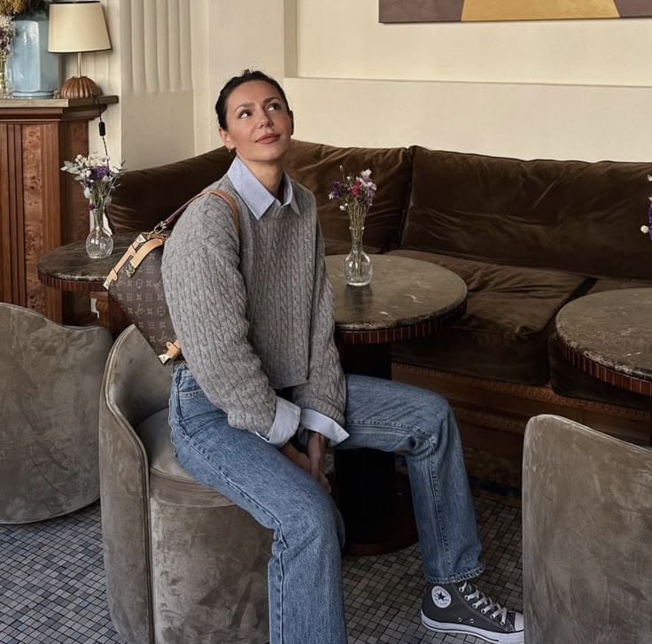 They’re giving cozy café-core in a grey cable knit sweater layered over a light blue button-up shirt, paired with straight-leg blue jeans for that effortless preppy feel. Grey high-top Converse and a chic brown monogram backpack keep the whole look relaxed but still totally on point for a coffee date.