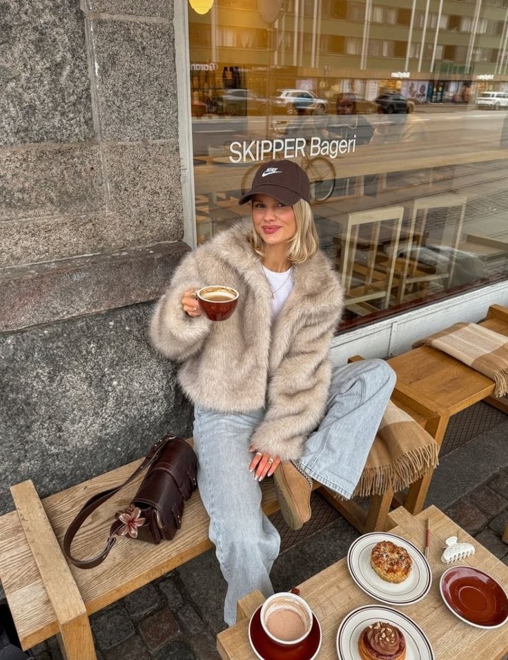 She’s keeping it cozy at the café in a fluffy beige faux-fur jacket over a simple white top, styled with loose light-wash jeans for that effortless Scandi brunch vibe. Tan ankle boots, a brown baseball cap, and a structured brown crossbody bag finish the look while she sips her coffee and snacks on pastries.