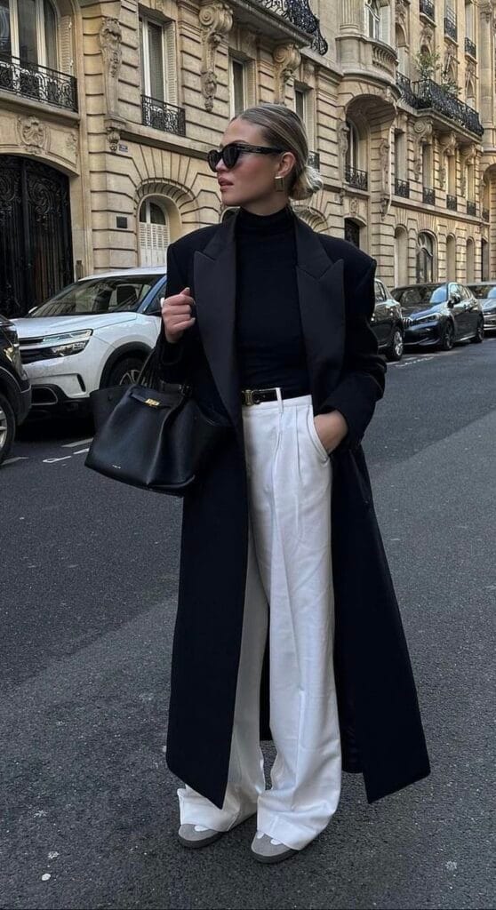 11. Sleek Black Coat with Black Turtleneck and White Wide-Leg Trousers
