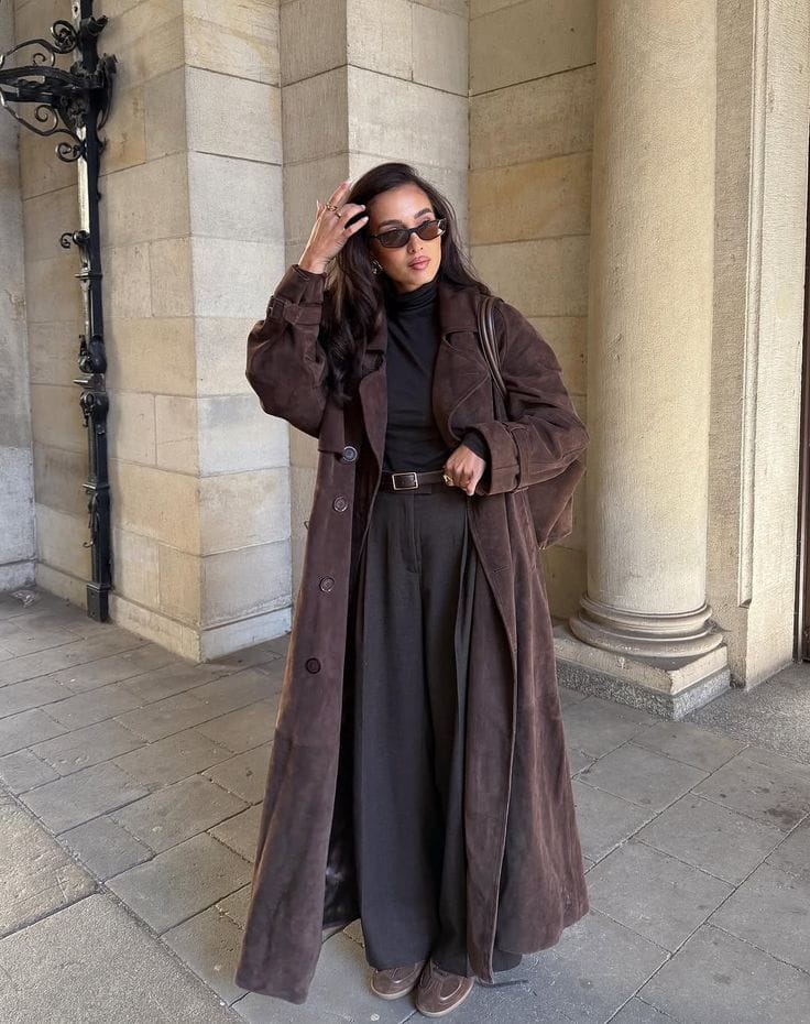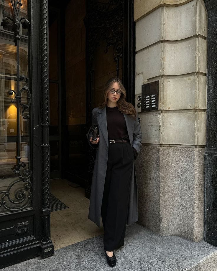 She’s giving refined city energy in a long charcoal trench-style coat layered over a fitted dark brown top and high-waisted black tailored trousers. Classic black flats, a slim belt, and a small black clutch keep the monochrome look polished and perfect for an elegant day-to-night moment.