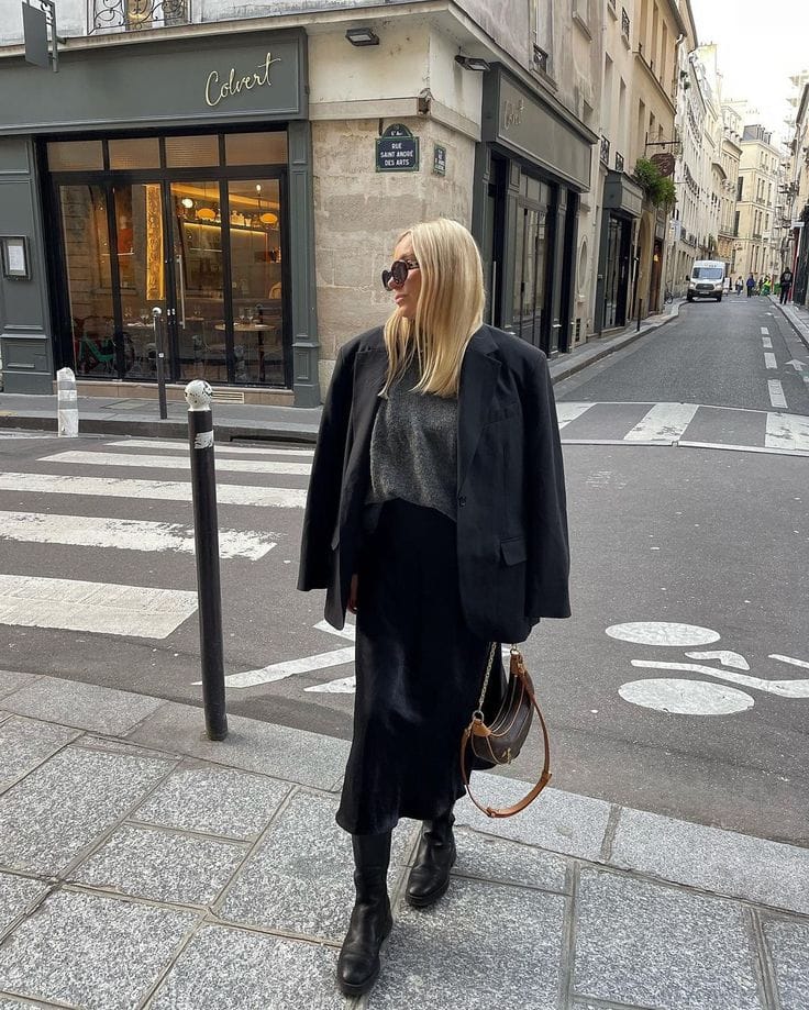 She’s strolling the city in an oversized black blazer thrown over a relaxed grey sweater, paired with a silky black midi skirt for that effortless, monochrome mix of cozy and sleek. Chunky black knee-high boots, dark sunglasses, and a brown shoulder bag keep the look grounded and perfect for a chic coffee run or casual dinner.