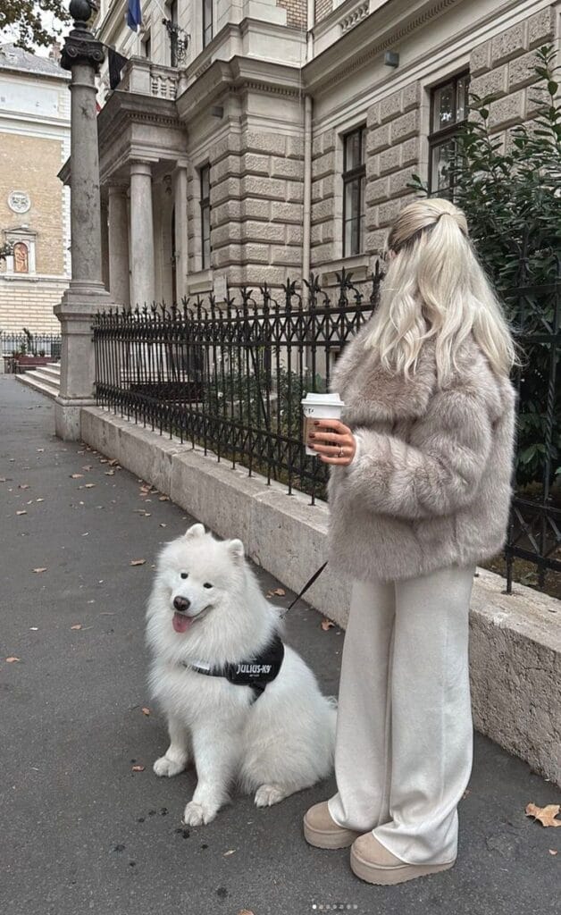 She’s out on a chic dog walk in a soft beige faux-fur jacket paired with flowy cream wide-leg trousers for the coziest monochrome moment. Chunky beige platform boots and a takeaway coffee complete the vibe, perfectly matching her fluffy white pup for the ultimate winter aesthetic.