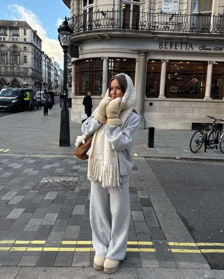 She’s bundled up in an oversized light-grey hoodie and matching wide-leg sweatpants, topped with a huge fluffy cream scarf and mittens for maximum sidewalk-snuggle vibes. Fuzzy beige slippers and a slouchy brown shoulder bag make the look feel like wearing a blanket outside—in the cutest possible way.