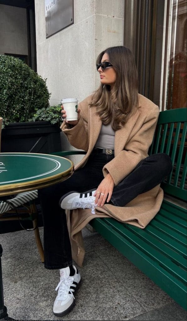 She’s giving chic café off-duty in a long camel coat layered over a fitted neutral tee, paired with straight black jeans for that easy, timeless combo. Classic white-and-black sneakers, a black belt, and a takeaway coffee keep the whole outfit looking relaxed but still super put-together.