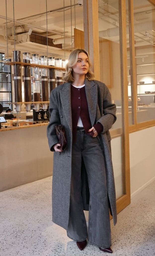 2. Chic Grey Coat with Wine Cardigan and Wide-Leg Jeans