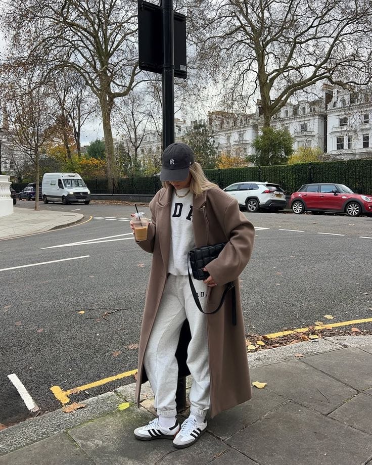 She’s doing elevated athleisure in a long camel coat thrown over a light grey slogan sweatshirt and matching joggers for that cozy, on-the-go look. A dark baseball cap, black quilted crossbody, and classic white-and-black sneakers make it feel sporty but still super put-together while she sips her iced coffee.