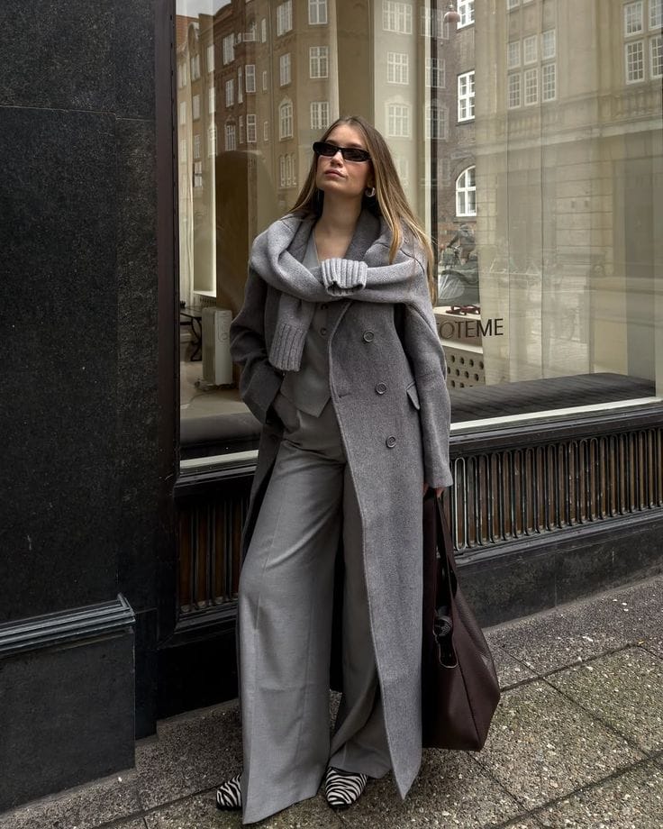 She’s serving chic monochrome in a long double-breasted grey coat layered over a matching grey blazer and wide-leg trousers, with a chunky grey knit casually draped over her shoulders. Zebra-print flats and an oversized brown tote add a fun twist and a bit of contrast to this sleek city-ready outfit.