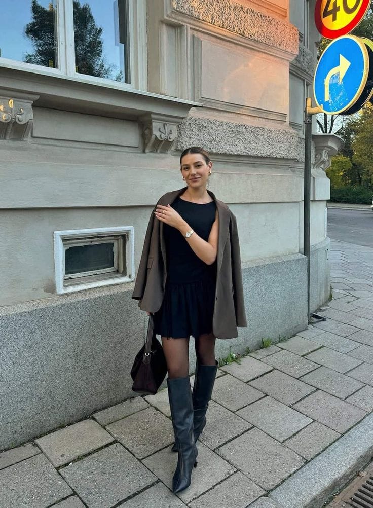 23. Sleek Black Mini Dress with Structured Blazer and Tall Boots