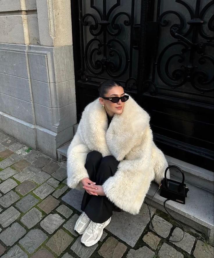 She’s bundled up in a plush cream faux-fur coat over an all-black base with slim trousers, giving major cozy-chic vibes while she’s perched on the cobblestones. The look is topped off with chunky white sneakers, mini structured bag, and gold earrings for that cool, off-duty Stockholm feel.