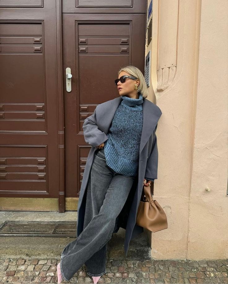 She’s rocking a long slate-grey coat layered over a cozy chunky blue turtleneck, paired with relaxed charcoal wide-leg jeans for that cool, laid-back vibe. Pink pointed heels and a slouchy tan bag add a fun pop of personality that keeps this Stockholm street look feeling playful and polished.